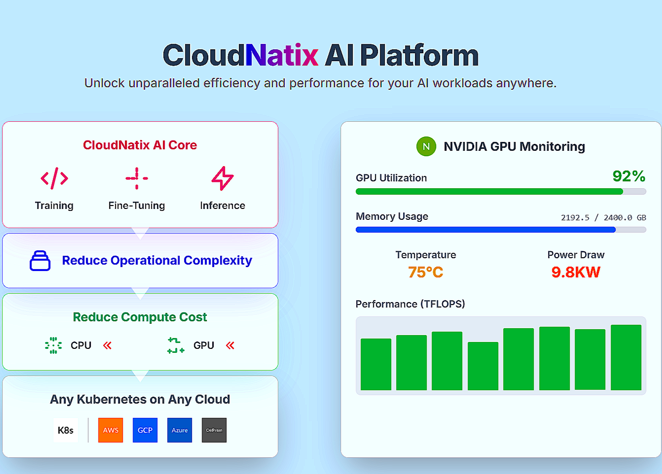 Accelerate your AI journey by having your team quickly build and use LLM applications in production. Run inferences on edge or in cloud at scale. Use any open model like Llama in your cluster on any cloud or on-prem. CloudNatix provides the LLM training and inference infrastructure stack.